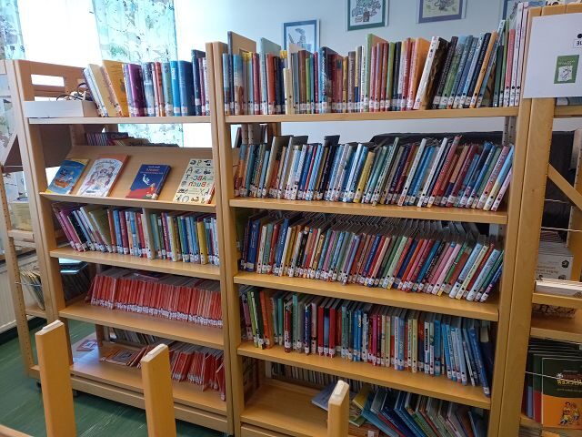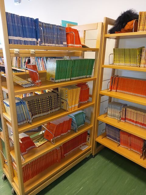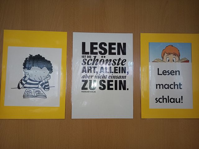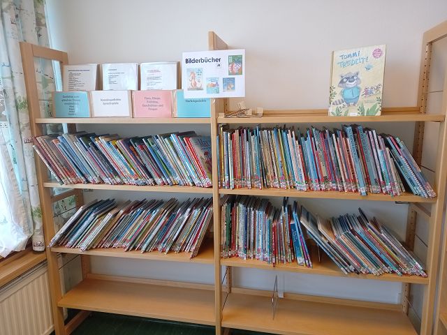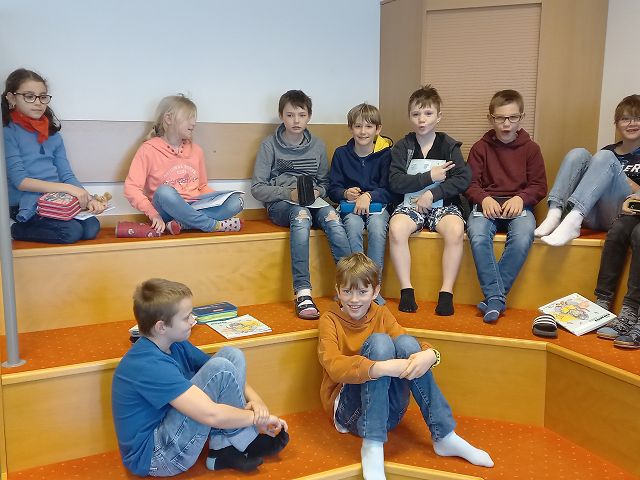 Einmal wöchentlich besuchen die Kinder im Rahmen des Deutschunterrichts mit ihrer Klassenlehrerin die Bibliothek. Sie können dann in den Büchern schmökern und lesen. Darüber hinaus dürfen die Bücher auch für 1-2 Wochen ausgeliehen werden.